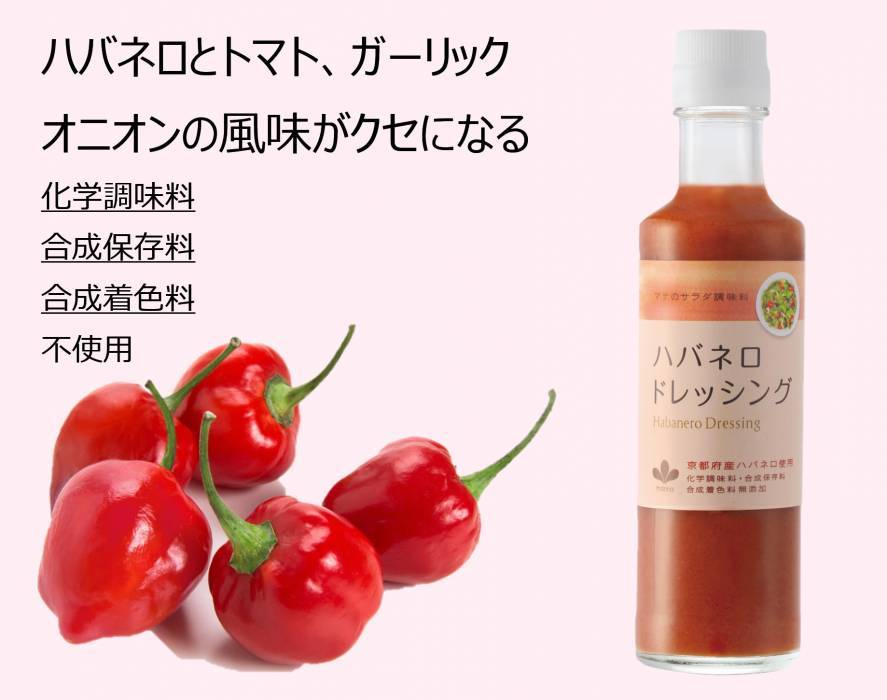 サラダ調味料ハバネロドレッシングはトマト、たまねぎ、青森県産にんにくの味をベースに、オリーブオイルと京都府産ハバネロを加えて仕上げた激辛ドレッシングです。
